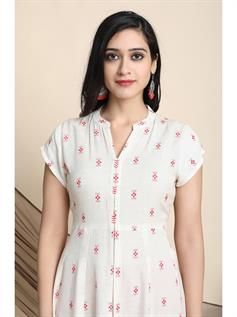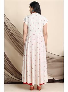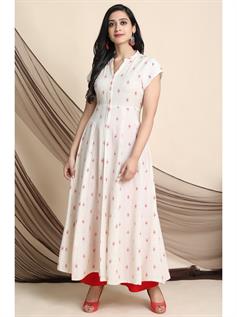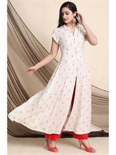 Make a gorgeous addition to your ethnic collection with this beautiful frontslit Anarkali Kurti Palazzo Set from janasya. Designed keeping the latest trends in mind this blended fabric is tailored to offer you a superior, unmatched softness and wear comfort. Featuring frontslit, this anarkali style has woven design in contrasting red color with mandarin collar and half sleeves. It comes with red colored solid cotton flex palazzo which has a partially elasticated waistband. Pair this kurta set with wedges and jhumkas to complete the look.
