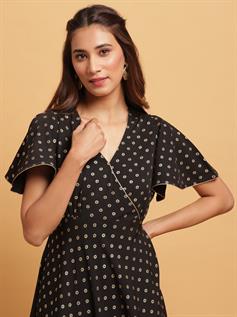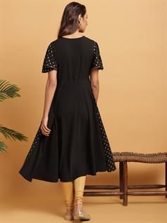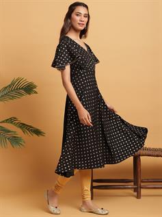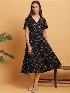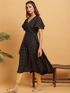 If simplicity is your cup of tea, this Black Kurta from Janasya is a must-have. Made with perfection this kurta has bell sleeve complementing it's flared silhouette and V overlapping style neckline with floral print in gold colour all over front panel. Team it with leggings and chaandbalis for festive look.