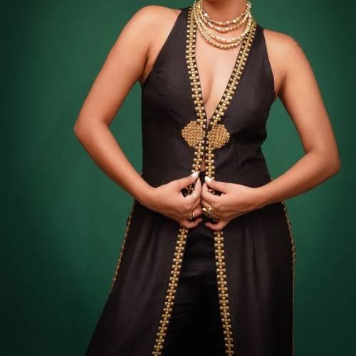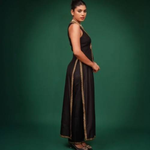 We are counted in the league of distinguished and renowned manufacturer and exporter of Women's Hand Embroidery Co-ord Set. A black cape over straight pants, accented with metallic embroidery along the edges and hem. The plunging neckline, with a central embroidered motif, can be styled as is or paired with a bralette for added versatility.