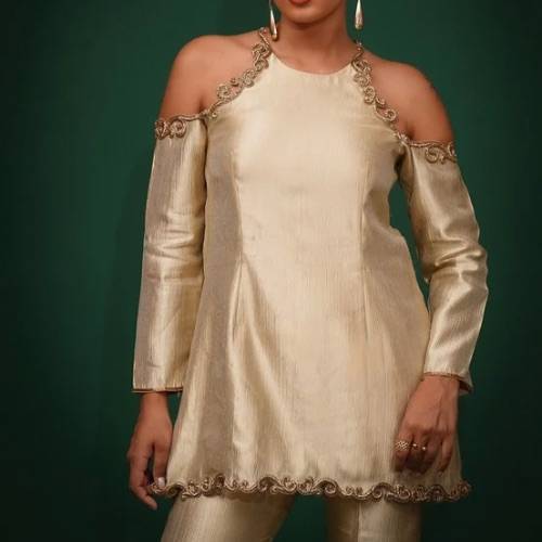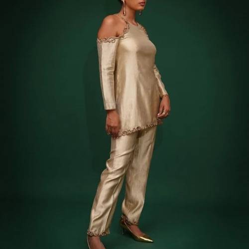 We are a top-ranking company which is specialized in Women's Co-ord Set. Crafted in a rich champagne-hued satin with a subtle sheen, this cold-shoulder kurta & pants feature intricate cut-out embroidery. With ornate detailing on the neckline and hem, the silhouette flows effortlessly.