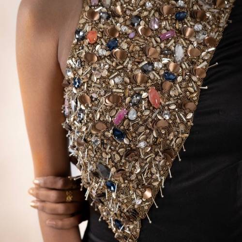 We take immense pleasure and pride in introducing our company as one of the leading manufacturers & exporters of Women's Sleek Mini Dress. This sleek black mini dress features a structured fit that contours the body, enhanced by a subtle thigh slit and a single full-length sleeve. A hand-embroidered panel cascades diagonally across the bodice, adorned with Dabka gold metallic threads, crystals, and gemstones. The intricate embellishments create an armor-like effect, making this dress a true statement of luxury and power.