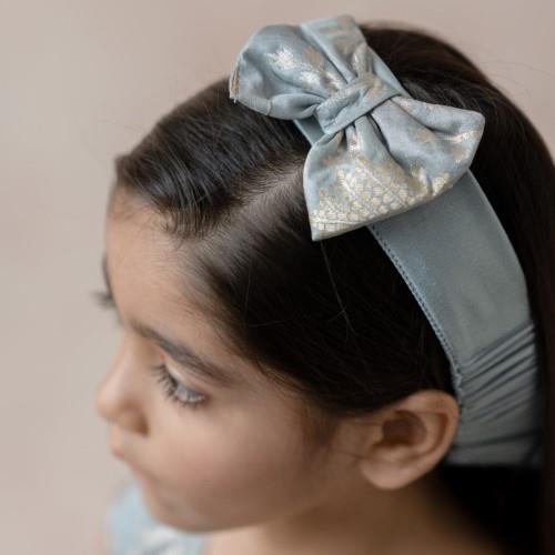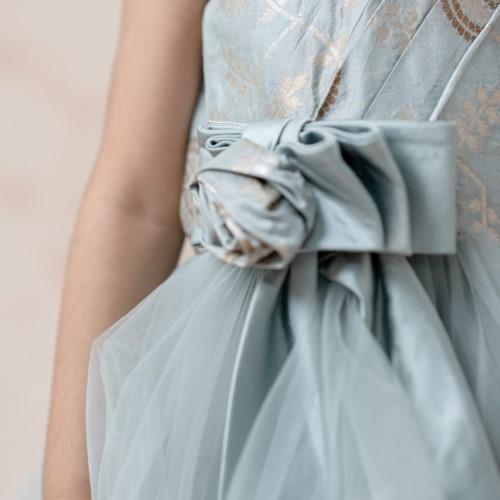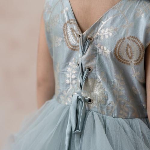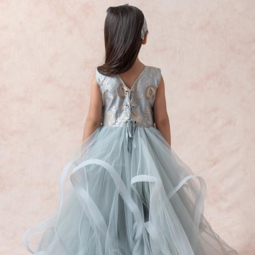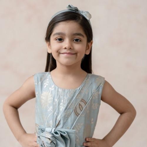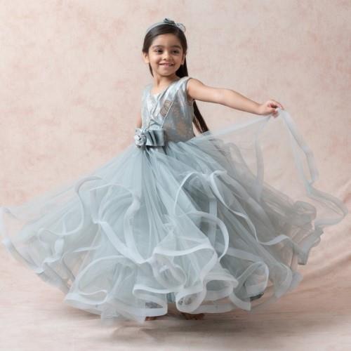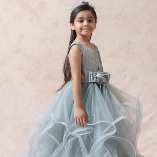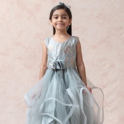 We take immense pleasure and pride in introducing our company as one of the leading manufacturers & exporters of Kid's Pure Ruffled Frock. We are engaged in the manufacturing of a Pure Brocade Silk Gown with Ruffled Net Overlay in Steel Blue-Grey Color. The gown is adorned with a large brocade and satin bow at the front and secured with a string closure at the back, offering both elegance and comfort. It is paired with a complimentary brocade silk hairband with a matching bow, completing the ensemble. The inside finishing is neatly concealed, ensuring that stitches remain hidden and do not irritate a child’s delicate skin. Additionally, a safety flap is provided to cover the zipper and hook edges, preventing them from rubbing against the child’s soft skin. This gown is crafted with premium fabrics, thoughtful detailing, and child-safe construction, making it perfect for special occasions, weddings, and festive celebrations.