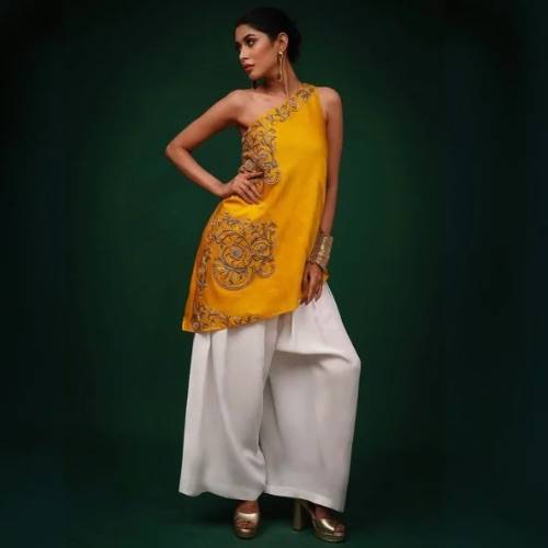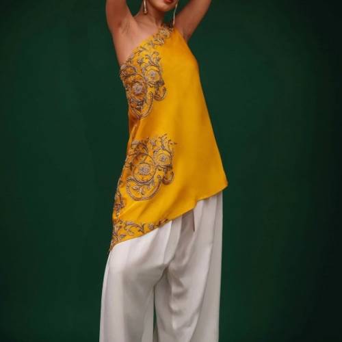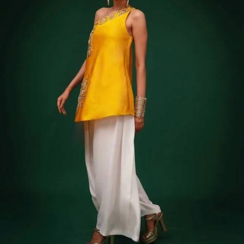 We are an efficient producer and exporter of Women's Kurta Set. Yellow bemberg silk one-shoulder kurta, richly adorned with intricate dabka embroidery inspired by Lai Thai art.