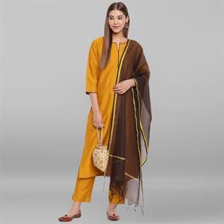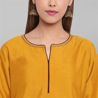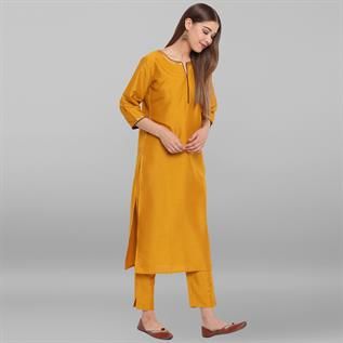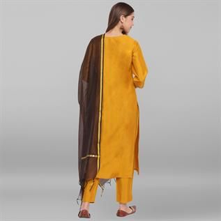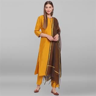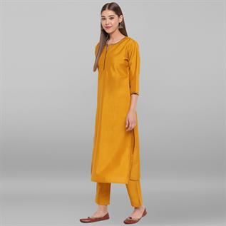 Get noticed for your style sense by wearing this Salwar Suits and pant set with dupatta from Janasya. The round neckline, the sequins work and the three-quarter sleeves of the kurta add to its solid design. The solid partially elasticated bottom is made of poly silk and the dupatta is made of art silk with woven design in it. Club it with a pair of stilettos to complete the look.