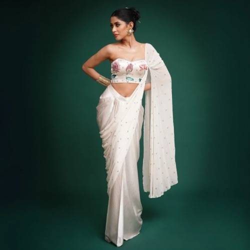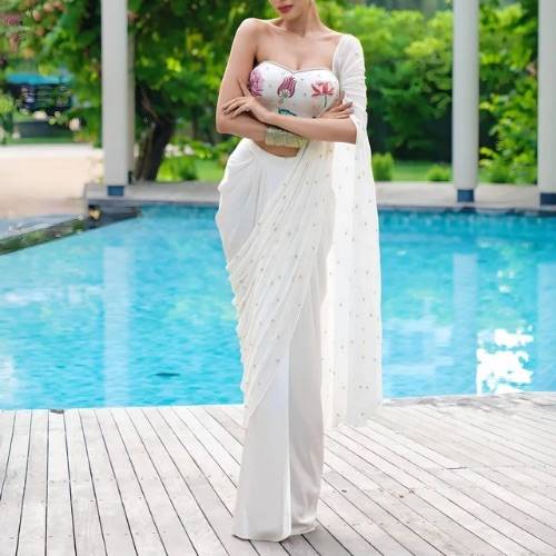 We are a prominent wholesaler & exporter of Women's Pre-Draped Saree & Blouse. A satin pre-draped saree inspired by the serene lotus pond at Saraswathi Temple in Bali. Paired with a hand-embroidered tube blouse featuring blooming lotuses, and a soft bemberg georgette pallu with scattered booti embroidery. Calm, elegant, and quietly powerful.