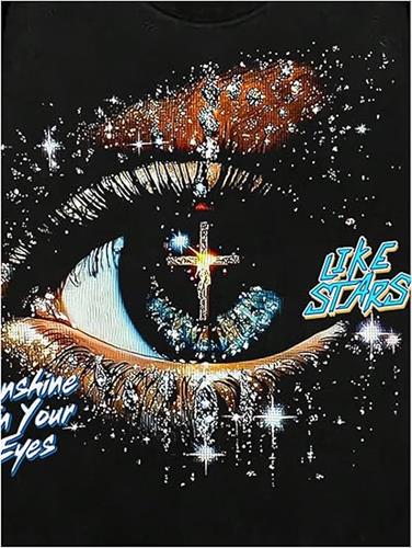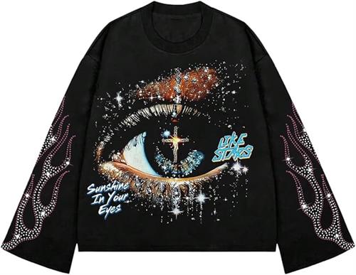 We are a top-ranking company which is specialized in Men's Graphic Rhinestone Eye Print Long Sleeve T-Shirt. This men’s rhinestone graphic t-shirt is designed with a bold eye print and premium rhinestone embellishments, giving it a unique hip-hop and streetwear vibe. Crafted for both comfort and style, this long-sleeve t-shirt is perfect for casual wear, parties, concerts, or urban street fashion.