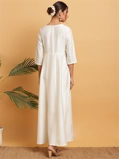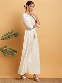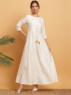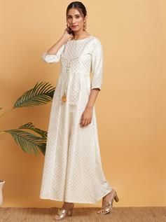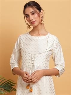 Unveil your refined stylish quotient by wearing this off White Kurti from Janasya. Shaped from poly silk, it looks ravishing with anarkali silhouette and its tie-up design at yoke. The round neck and three quarter sleeves with gold print over-all adds to its appeal. Team it up with Chandelier Earrings and stilettos to stand-out from crowd.