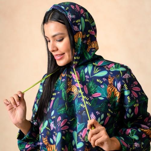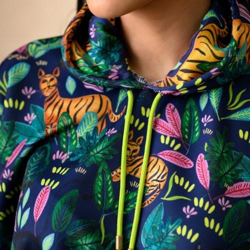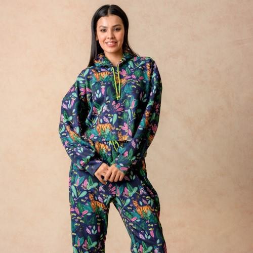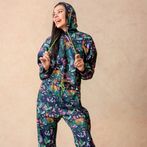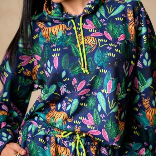 We introduce our self as a pioneer in the field of Women's Jungle Print Short Track Suit. We are engaged in the manufacturing of Jungle Print Short Hoodie & Jogger suit. The hoodie is crafted in a stretchable fabric for enhanced comfort and features a neon adjustable drawstring at the hood for a trendy look. It is paired with a matching jogger designed with a neon adjustable drawstring with metal tabs and side pockets for functionality. The track suit comes in a relaxed fit silhouette, making it stylish, comfortable, and perfect for travel wear, casual outings, and leisure purposes.