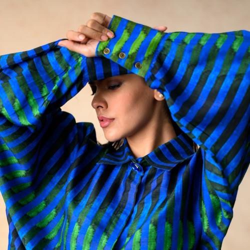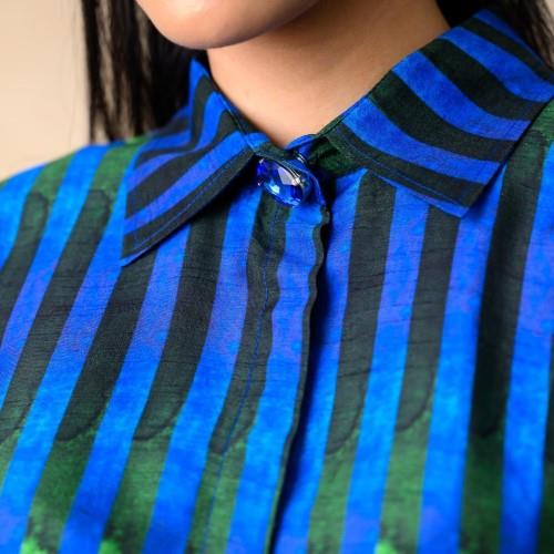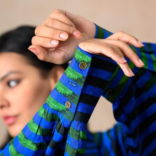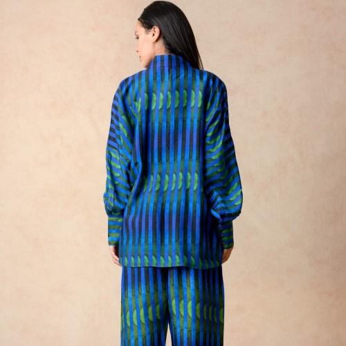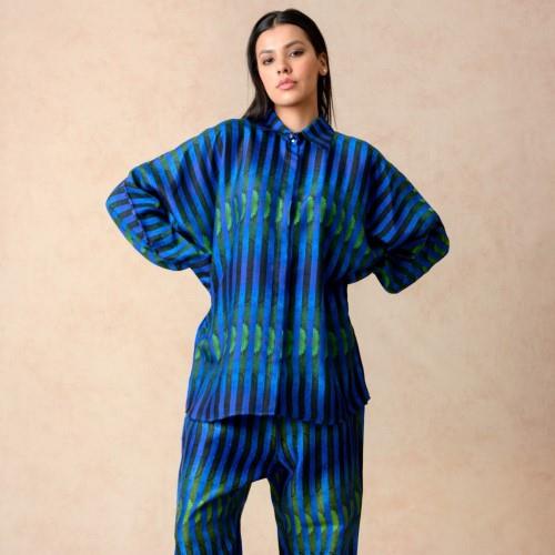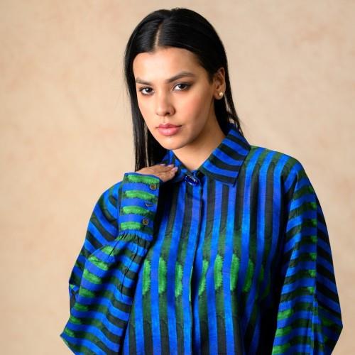 We are a prominent wholesaler & exporter of Women's Stripes Print Co-ord Set. We are producers of a stylish stripes print co-ord set, featuring a shirt with bat-style sleeves detailed with cuffs and metal buttons, and a stone-embellished collar with a hidden placket. The set is paired with a matching pant-style palazzo, designed with a side zipper and back waist elastic for comfort and fit. The palazzo is fully lined for ease of wear, and the collection is size-inclusive, blending contemporary design with practical detailing.