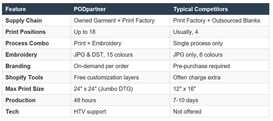 Traditional POD providers aren't doing anything wrong, they're operating efficiently within their model. But that model creates inherent constraints. Here's how the differences break down: