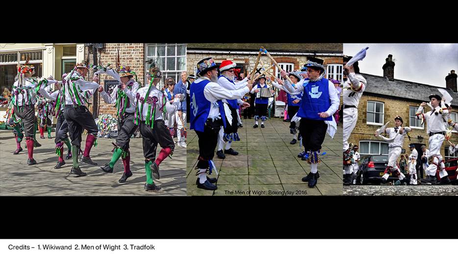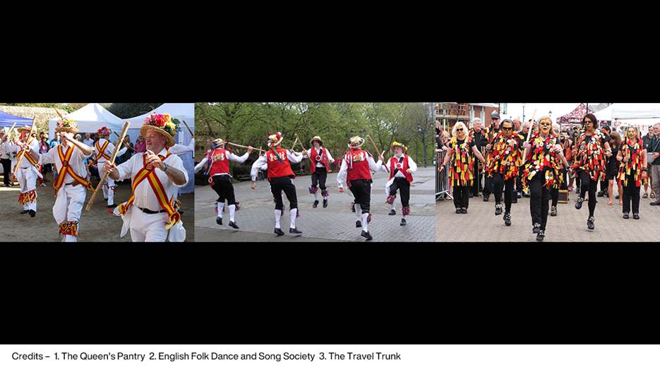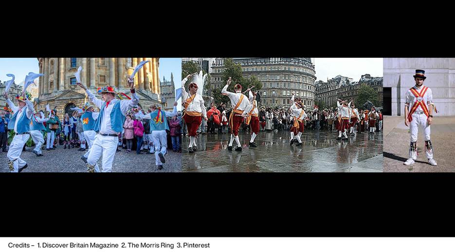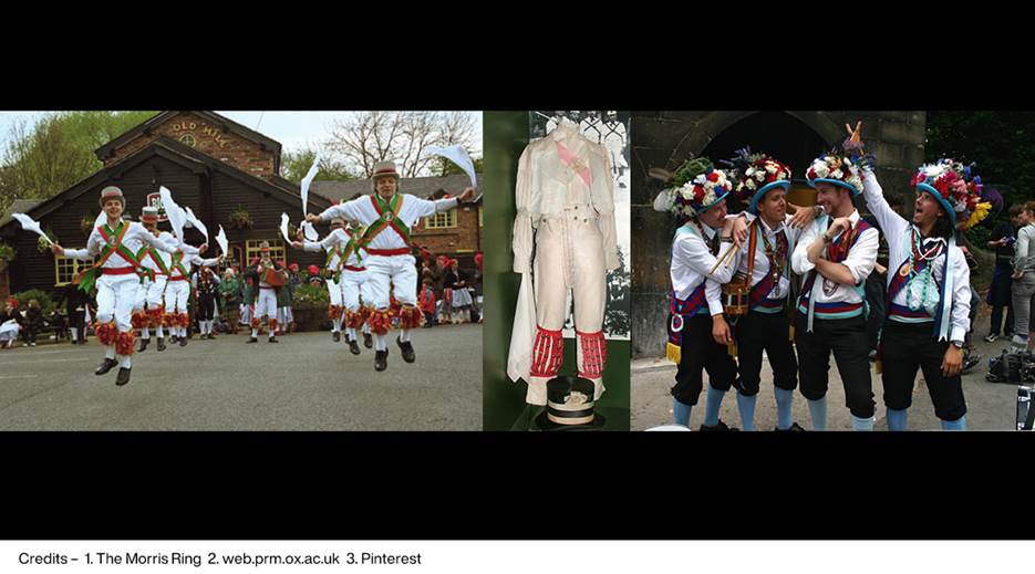 • Wearing a Morris dance costume is a carefully considered process. The base usually consists of a white shirt and trousers, chosen for comfort and ease of movement.
