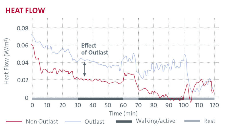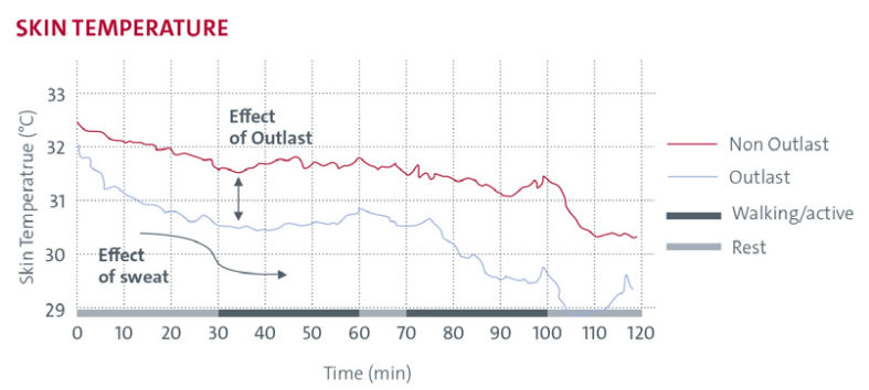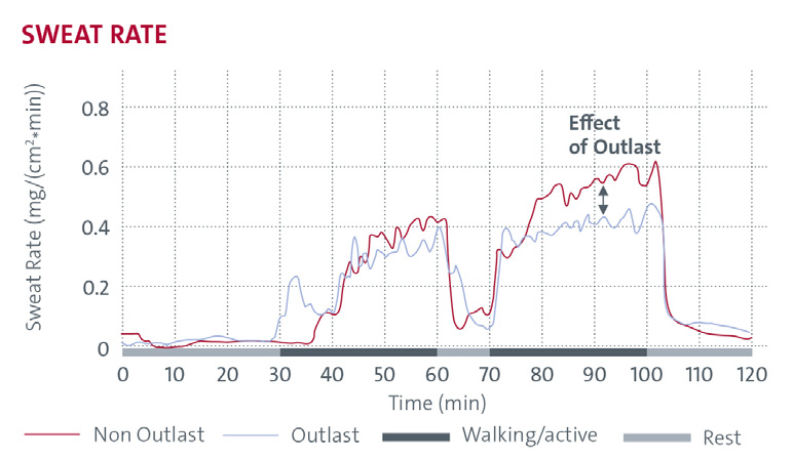 Chest sweat rate measurements indicate that Outlast® supports effective thermal regulation while reducing perspiration. By absorbing excess body heat and stabilising skin temperature, Outlast® limits peak sweat responses and delays the onset of sweating, contributing to improved comfort and reduced moisture perception during wear. After activity, the heat stored within the textile is gradually released back to the body, helping to minimise post-exercise cooling and the sensation of chilling.