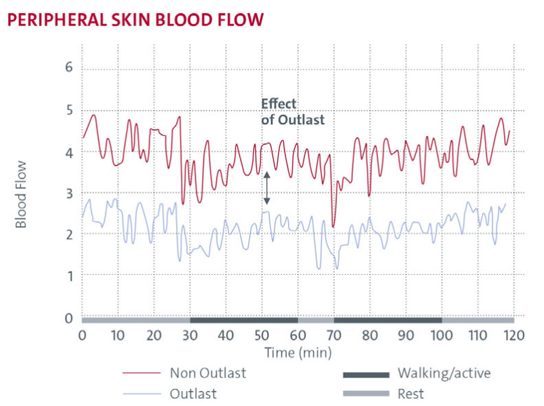 Human thermoregulation is primarily controlled by changes in peripheral skin blood flow. When excess heat accumulates, vasodilation increases blood flow to the skin, raising skin temperature and triggering sweating. The Skinos studies show that Outlast® temperature-regulating materials absorb excess body heat early, thereby reducing the need for vasodilation. As a result, peripheral skin blood flow remains significantly lower compared to non-Outlast garments, particularly during prolonged activity. This leads to more stable skin temperatures, delayed and reduced sweating, and lower physiological strain. For the wearer, this translates into a drier microclimate, improved thermal stability, and sustained comfort across activity and rest phases.