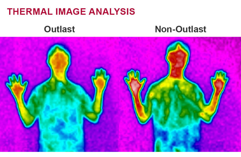 The thermographic results visually support the measured data, confirming that Outlast® effectively absorbs and redistributes excess body heat, leading to a more stable skin temperature profile and improved thermal comfort during prolonged wear.